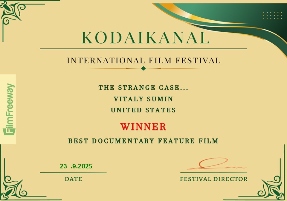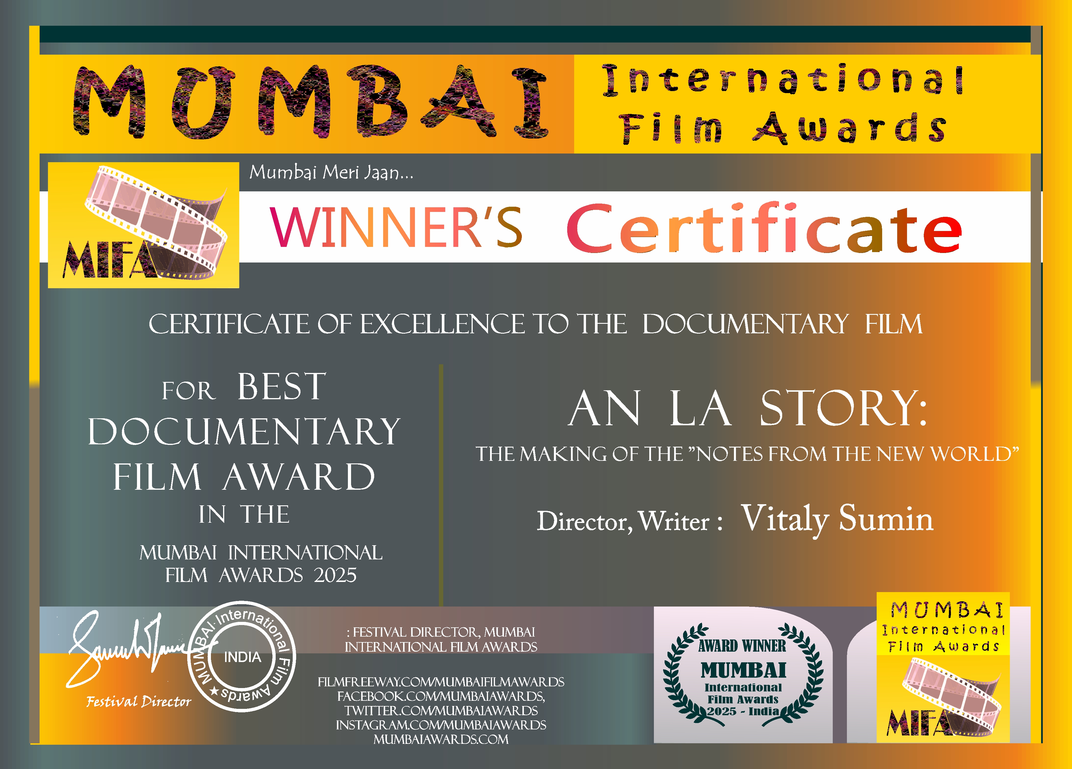 is pleased to announce that our feature length movie Notes from the New World won recently one more award as the Best Feature Film in the last session (July-October, 2023) of Art Film Awards (AFA) - in Skopje, capital of North Macedonia. This is our 32nd award for The Note s and 66th award for Vitaly Sumin (as writer-producer-director)Stay tuned! -